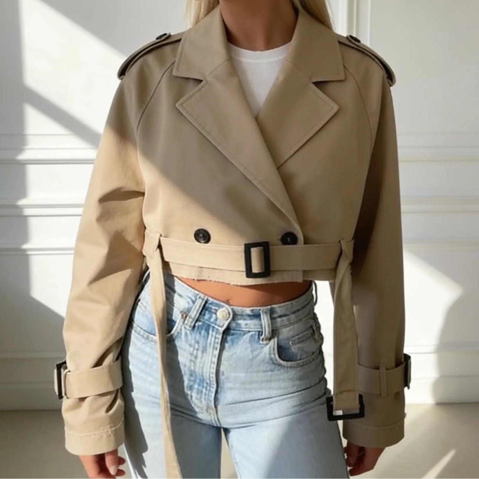 The cropped length brings freshness and a modern edge to the traditional trench coat, creating a balanced and current silhouette.